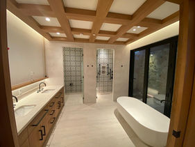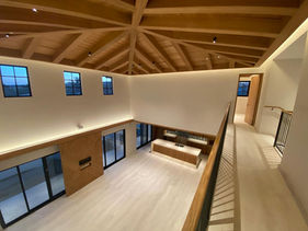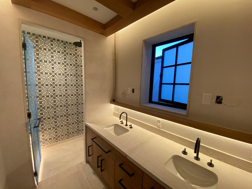 En este proyecto se realizó un acabado en estuco blanco pulido sobre muros, complementado con pintura y detallado de plafones de Tablaroca con acabado tipo 5.